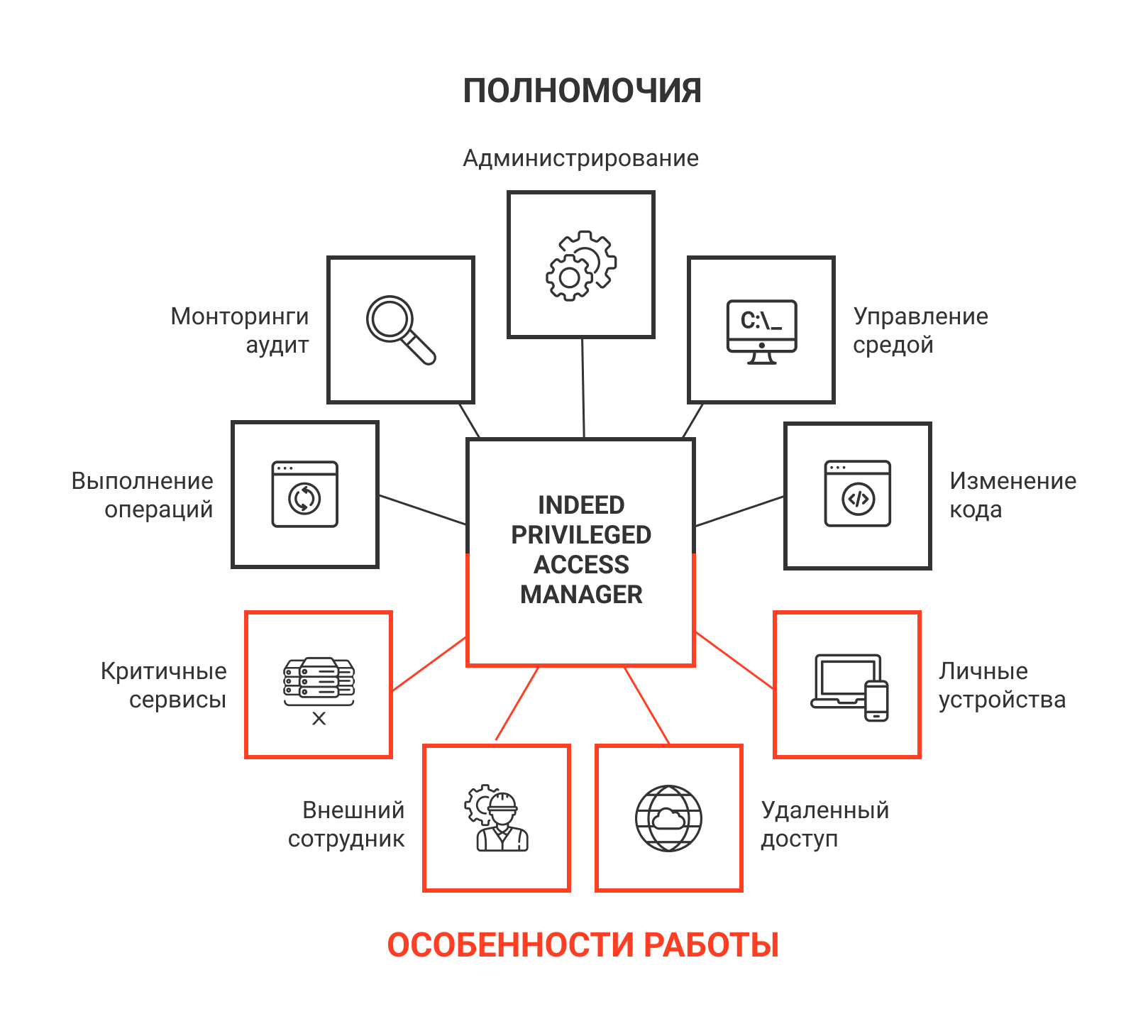 Полномочия на управление или настройку целевых ресурсов и приложений привязаны к соответствующим привилегированным учетным записям. При этом привилегированный пользователь может обладать несколькими учетными записями, которые и предоставляют расширенный доступ к информационным системам: изменение или удаление параметров, просмотр секретных данных и т. д.